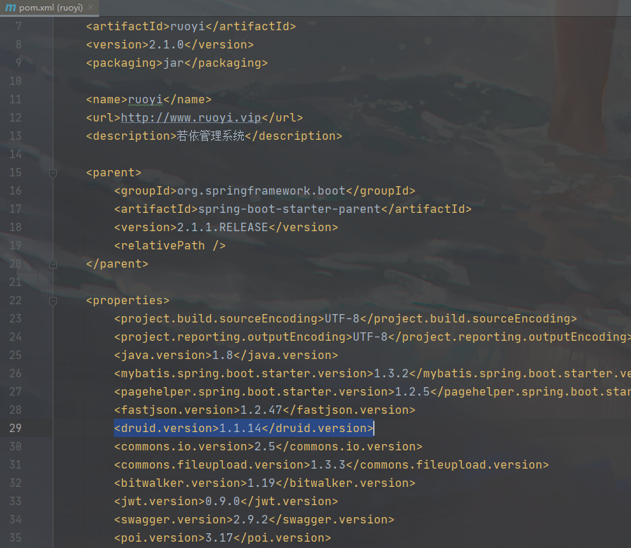 源码中看到 pom.xml 文件中查看到引用了 阿里Druid