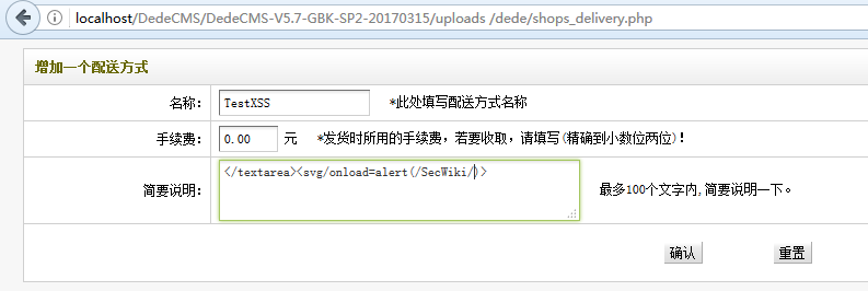 该漏洞比较鸡肋,需要登录 管理员后台通过 添加配送方式 功能 ,添加后在前后台都会触发 存储型 XSS