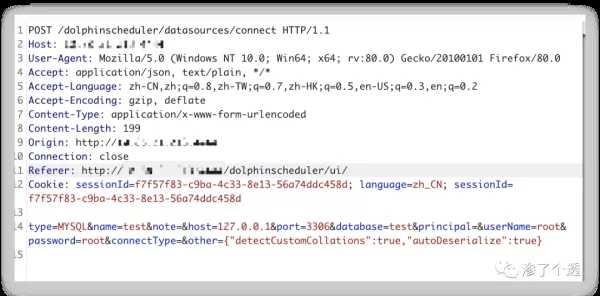 2、jdbc连接参数就是主⻆,这⾥没有限制任意类型的连接串参数。 ![](/static/baige/06-中间件框架漏洞/Apache/Apache%20DolphinScheduler%E9%AB%98%E5%8D%B1%E6%BC%8F%E6%B4%9E%EF%BC%88CVE-2020-11974%E3%80%81CVE-2020-13922%EF%BC%89/wp_editor_md_3554066562de399e0d191c5ce7d803ab.jpg)