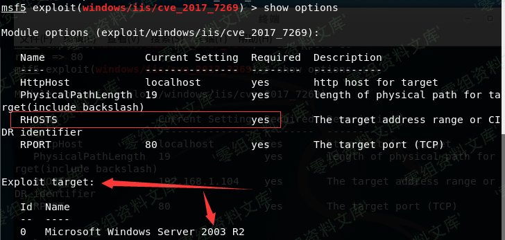 msf5 > set rhosts 192.168.1.104 // 设置目标的IP