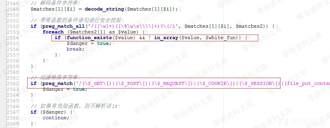 if (preg_match(‘/(\$_GET\[)|(\$_POST\[)|(\$_REQUEST\[)|(\$_COOKIE\[)|(\$_SESSION\[)|(file_put_contents)|(file_get_contents)|(fwrite)|(phpinfo)|(base64)|(`)|(shell_exec)|(eval)|(assert)|(system)|(exec)|(passthru)|(print_r)|(urldecode)|(chr)|(include)|(request)|(__FILE__)|(__DIR__)|(copy)/i’, $matches[1][$i])) {