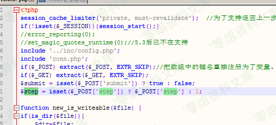 分析代码可以知道,setp为空的时候,初始化初始化的变量1,然后进入到step_1.php,有install.lock,就不能重装,所以我们这里直接POST step = 2绕过