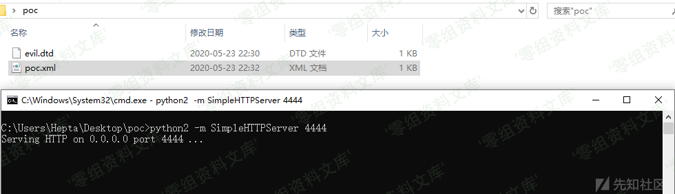 该XXE属于Blind XXE,我们构造以下恶意xml代码,它会去调用位于我们的攻击主机上(这里以本地启动的Http服务模拟)的外部dtd文件(不在同一个文件写入要读取的文件主要是为了避免参数实体引用时发生的错误):