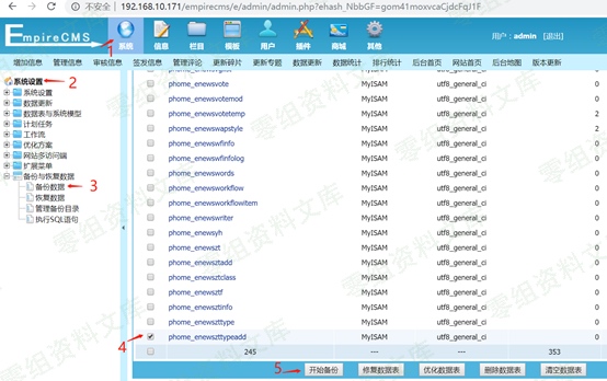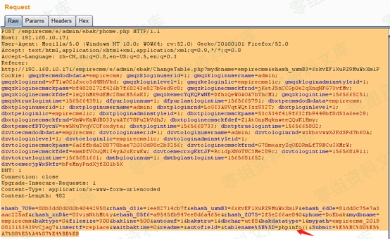漏洞代码发生在后台数据备份处代码/e/admin/ebak/ChangeTable.php 44行附近,通过审计发现执行备份时,对表名的处理程序是value=”” 通过php短标签形式直接赋值给tablename[]。