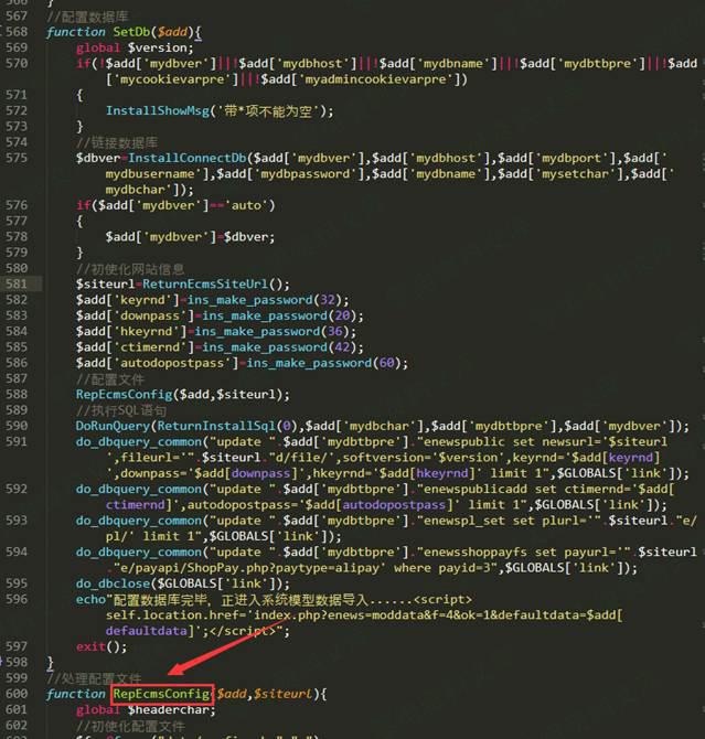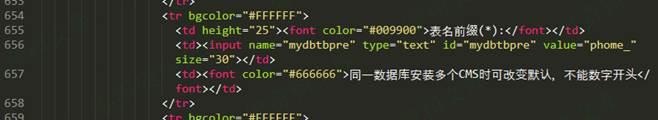 开始进行审计安装程序,根据经验安装问题一般出现在配置数据输入配置时导致,常见引发问题漏洞的参数用户输入数据库名参数、可控的表前缀等可控参数,于是乎定位到代码位置install/index.php 645行附近,可以看到表名前缀phome_,并将获取表名前缀交给了mydbtbpre参数。继续往下看并跟踪参数传递。
