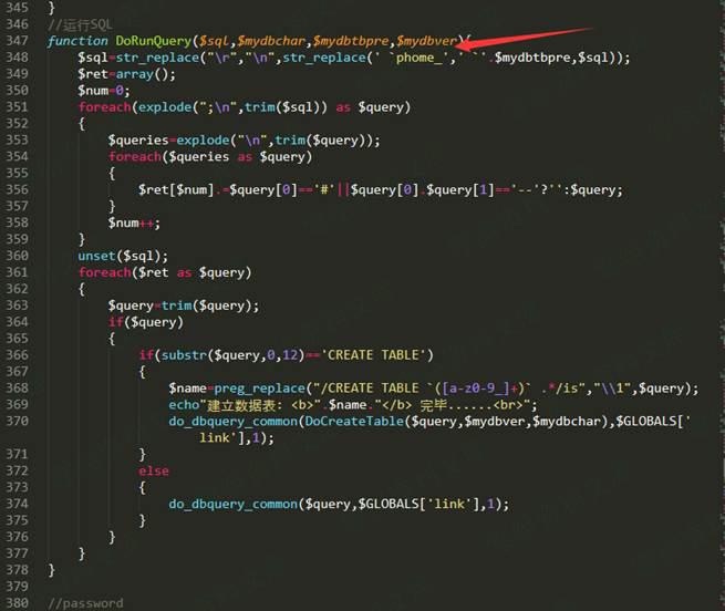 在代码位置/e/install/data/fun.php 347~379行发现,将用户前端输入的表前缀(默认phome_)替换掉默认的phome_后带入了sql语句中进行表的创建,并且可以发现过程中未作过滤。