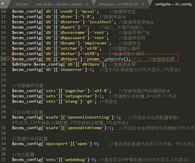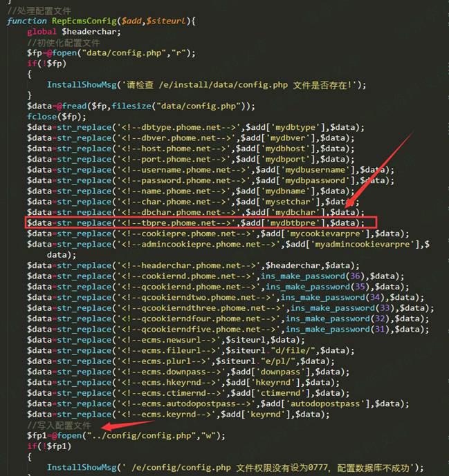 创建表的同时将配置数据包含可控的表前缀一起写入到config.php配置文件,代码位置/e/install/data/fun.php 587~645行