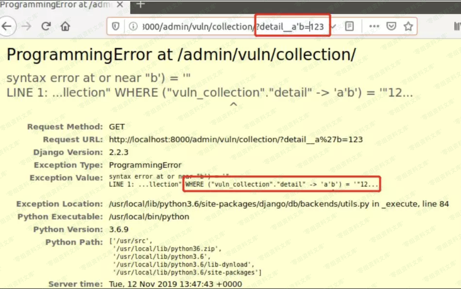 `http://ip:8000/admin/vuln/collection/?detail__a%27b=123`