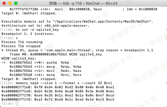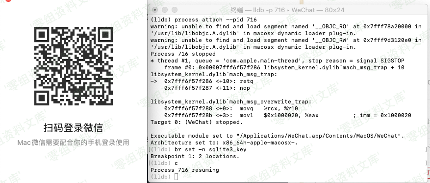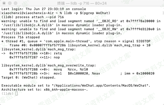 > 在终端下下输入 `lldb -p $(pgrep WeChat)` 进入 lldb 的子shell界面(LLDB是mac下的调试工具)