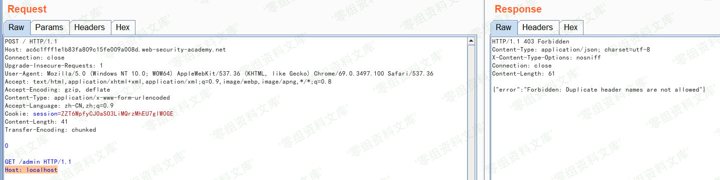 简言之,由于第二个请求的`Host header`与第一个请求中走私请求的`Host header`冲突,请求被阻止。